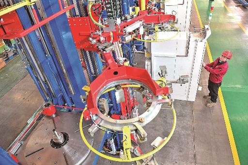 在青岛软控装备产业园,技术人员正在组装调试智能化轮胎成型机。青岛日报记者 赵健鹏摄